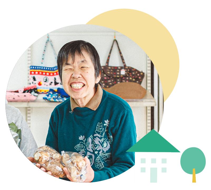 主にお客様の購入品の袋詰めやカゴ渡し、呼び込みをしています。また、漬物製造もしていますので、キュウリやナスを切ったり分量を量ったりと支援員のサポートのもと多岐にわたり作業を行っています。 -