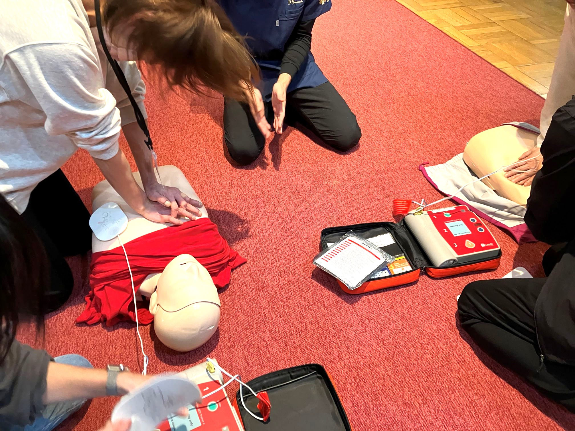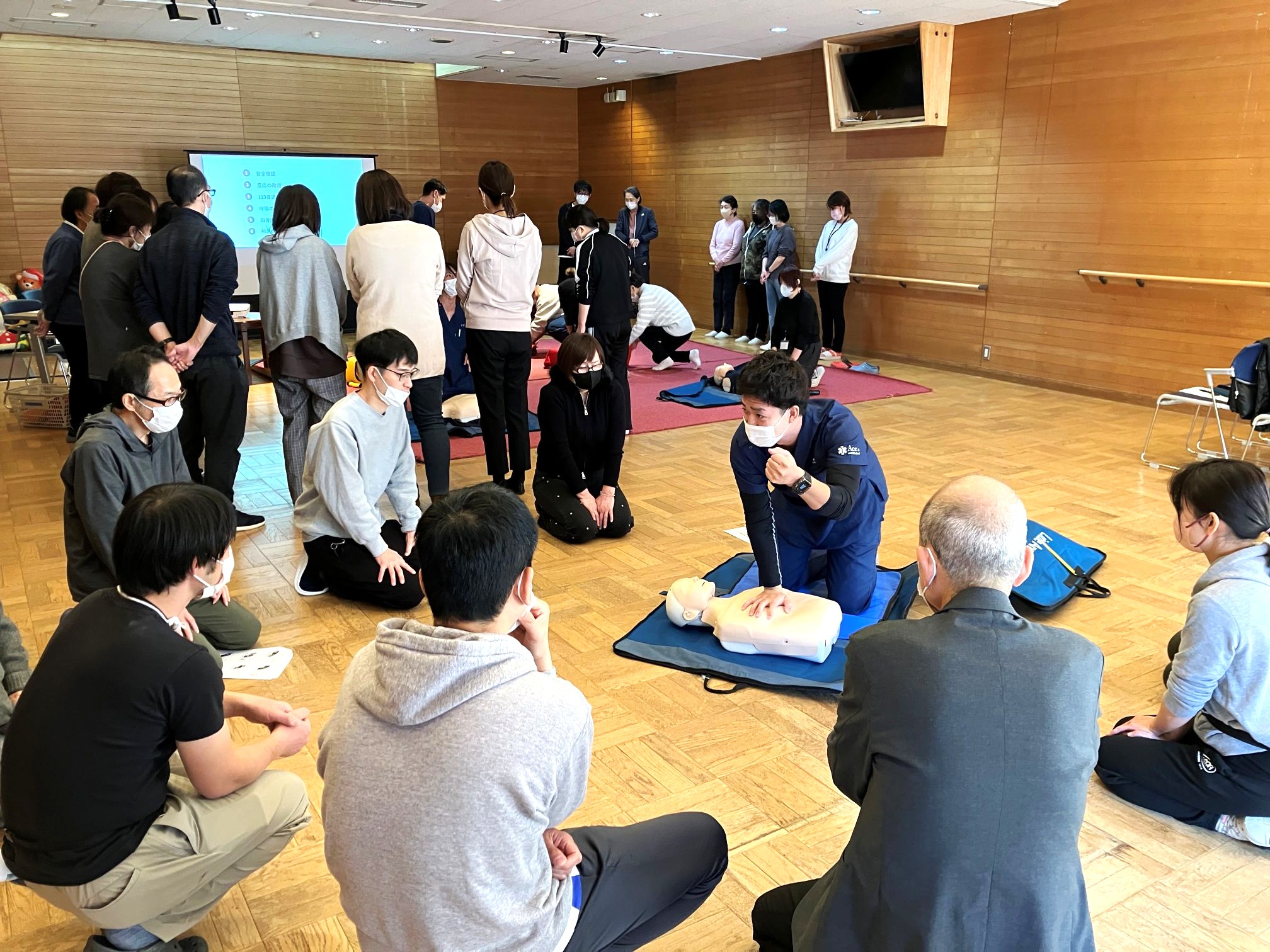 内容は①心肺蘇生講習、②窒息時のハイムリック講習、③外傷講習の3点です。