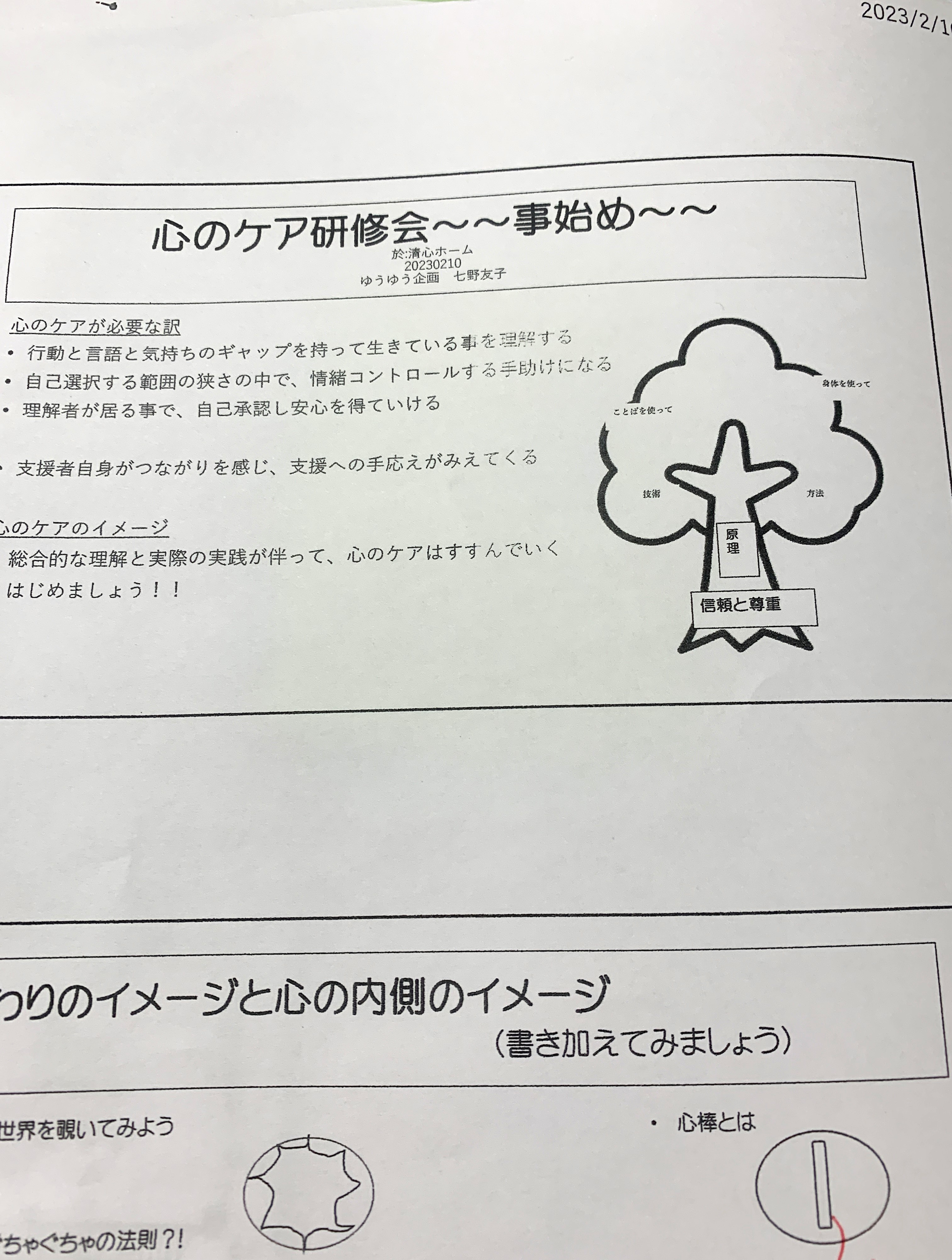 新しいスタッフも多く、再度心のケアの基本から学び直すということで「心のケア研修会~事始め~」というタイトルで基本の講義・ワークを行いました。